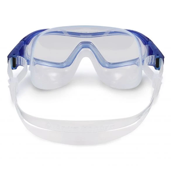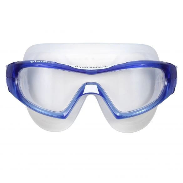 De Aqua Sphere Vista Pro transparante lens zwembril blauw biedt een 180 graden panoramisch gezichtsveld dankzij de gebogen enkele lens.