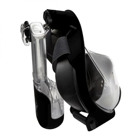 Wat dit masker onderscheid van andere full face maskers is dat de snorkelpijp beschikt over een zogenaamd klik-systeem waarmee je hem los en vast kunt maken zodat deze makkelijk op te bergen is.